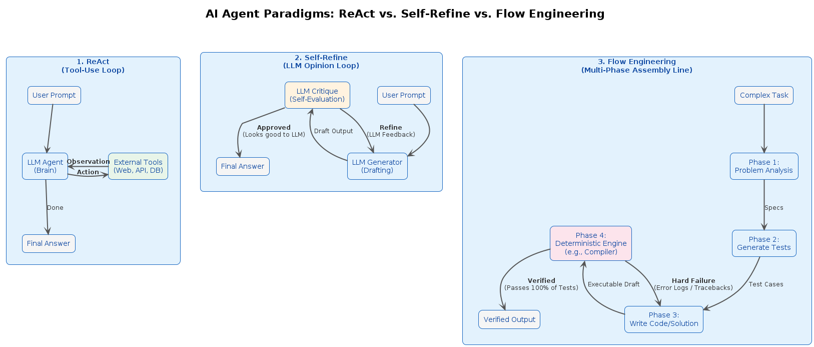 ReAct, Self-Refine, and Flow Engineering: The Three Paradigms Behind Modern AI Agents
